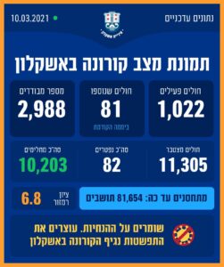 בימים האחרונים נפטרו שני תושבי אשקלון. עיריית אשקלון משתתפת בצער המשפחות ועומדת לרשותן בשעה קשה זו. ביממה החולפת: אובחנו 81 חולים חדשים בעיר.