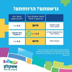 בנוסף, תושב אשקלון בעל תו תושב דיגיטלי יוכל ליהנות משעת חניה ראשונה חינם לעומת תושבי חוץ שיחלו בתשלום החל מהשעה הראשונה. לאחר השעה הראשונה יחול שינוי בתעריף החניה לשעה והוא יעמוד על 2.5 שקלים. התעריף עבור תושבי חוץ יעמוד על 6.3 שקלים לכל שעת חניה. השינוי בתעריף יחל כאמור, ביום שני הקרוב, כאשר ברצועת החוף הוא יחל בתוך מספר חודשים.