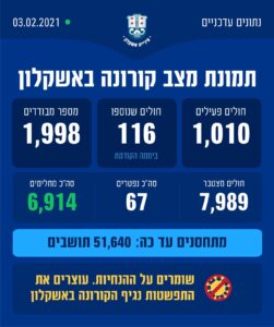 ביממה החולפת נפטר תושב אשקלון. עיריית אשקלון משתתפת בצער המשפחה ועומדת לרשותם בשעה קשה זו. ביממה החולפת: אובחנו 116 חולים חדשים בעיר. מספר המתחסנים בחיסון הראשון בעיר עד כה: 51,640!