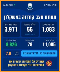 בסוף השבוע האחרון נפטרה תושבת אשקלון. ביממה החולפת: אובחנו 56 חולים חדשים בעיר.