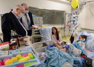 הנשיא ביקר בתינוקיה של בית החולים שהועברה לאזור הממוגן בימים האחרונים. היולדת עינב שהגיעה להאכיל את בנה סיפרה לנשיא על לידה בצל האזעקות הבלתי פוסקות ועל החרדה הגדולה. הנשיא אמר לעינב שכילד שנולד בירושלים המופגזת הוא מבטיח לה שגדלים לא רע בכלל, וביקש ממנה להמשיך עם החוסן ומצב הרוח המעודד שהיא משדרת. הנשיא חיזק את ידי הצוותים הרפואיים והודה להם על המקצועיות המופלאה שהם מפגינים בעבודה שהיא ממש תחת אש. "תודה לכם בשם אזרחי ישראל כולם, שימרו על עצמכם", הפציר הנשיא בצוות הרפואי.