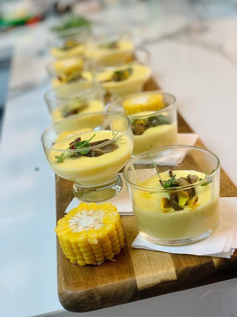 מוזגים מקרם התירס בקערה מניחים מעל מתערובת הפטריות, מעט פרמזן.
